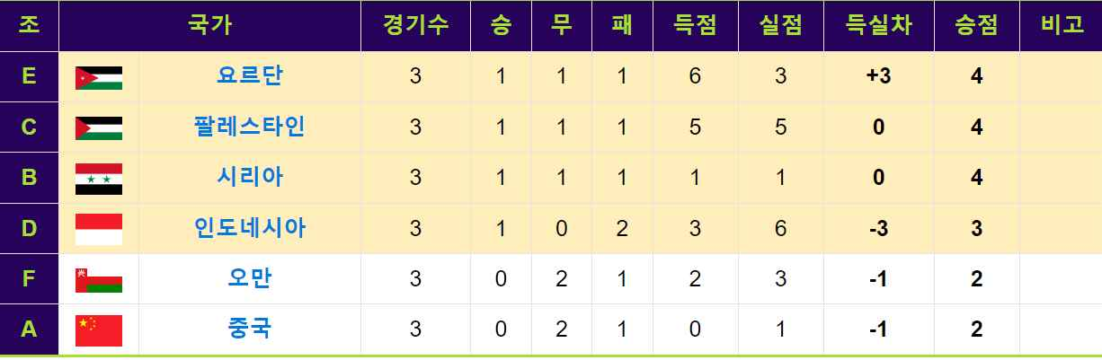 1위 요르단 2승 1 무 : 승점 7, 득실 차 0