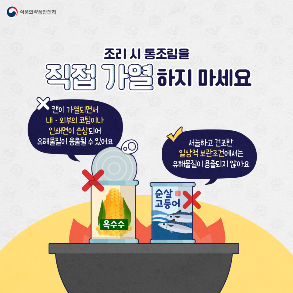 캔을 잘못 보관하거나 조리하면 일명 환경호르몬이라고 불리는 비스페놀 A가 용출될 우려가 있습니다. 통조림 캔을 직접 가열해 조리하거나 고온의 환경에서 보관하는 행위는 자제해야 합니다.