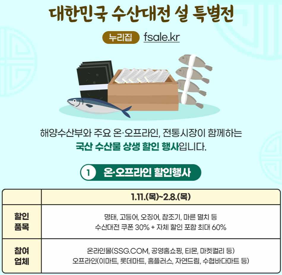 * 할인 품목 : 명태, 고등어, 오징어, 참조기, 마른 멸치 등 수산대전 쿠폰 30% + 자체 할인 포함 최대 60%