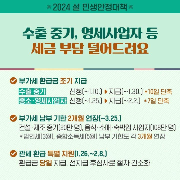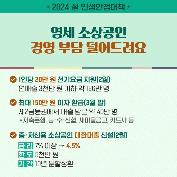 2024년 설 명절 민생안정 대책 설 연휴를 앞두고 정부가 중소업과 소상공인의 명절 유동성을 지원하기 위해, 1조 8,000억 원의 정책자금을 공급하며, 더불어 농 · 축 · 수산물에 대해 최대 60% 할인