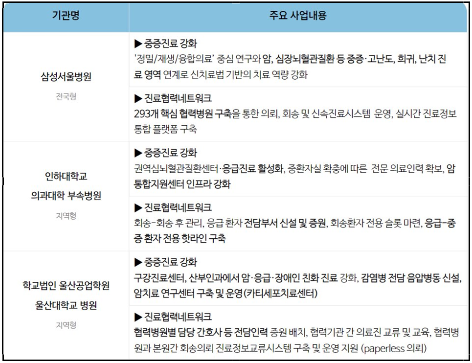 즉, 상급종합병원에서 반드시 진료가 필요한 중증 환자들이 원활하게 진료를 받을 수 있도록, 부상 및 질병의 정도가 경미한 환자들을 가까운 지역의 병원으로 회송하는 시스템을 구축하는 것이 이번 사업의 핵심입니다.