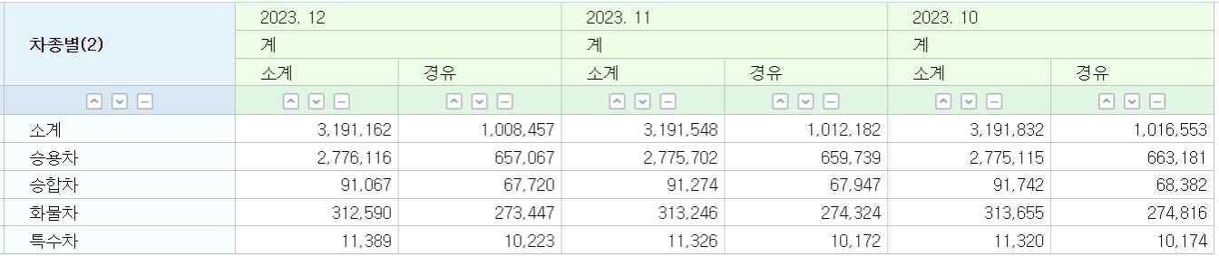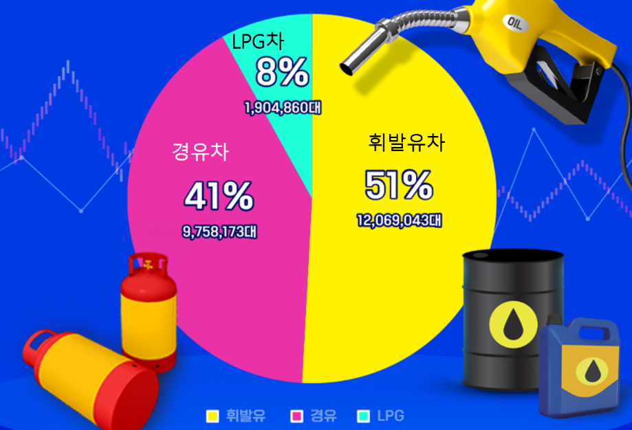 * 연료별 : 휘발유 12,314 천대, 하이 브리드 1,542 천대, 경유 9,500 천대, LPG 1,833 천대, 전기 544 천대, 기타 182 천대, 수소 34 천대 순
