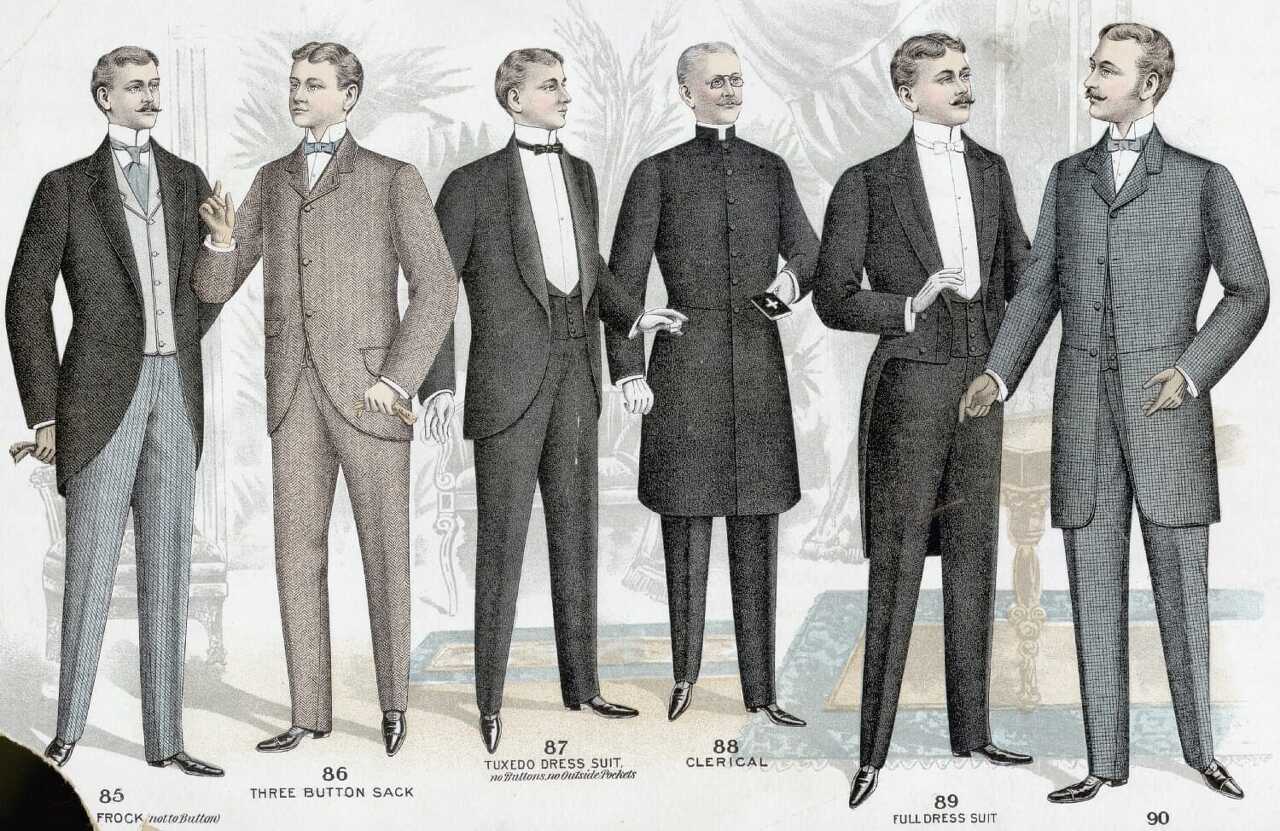 19세기 기본형이 그대로 지속되면서 기능별로 더욱 세분화되고, 편안한 스타일로 변화한다. 재킷의 길이는 길고 다양했으며 라펠(lapel)은 좁고 가슴 높이까지 단추를 달았고, 빳빳한 칼라깃이 머리와 목을 똑바르고 곧게 했다.