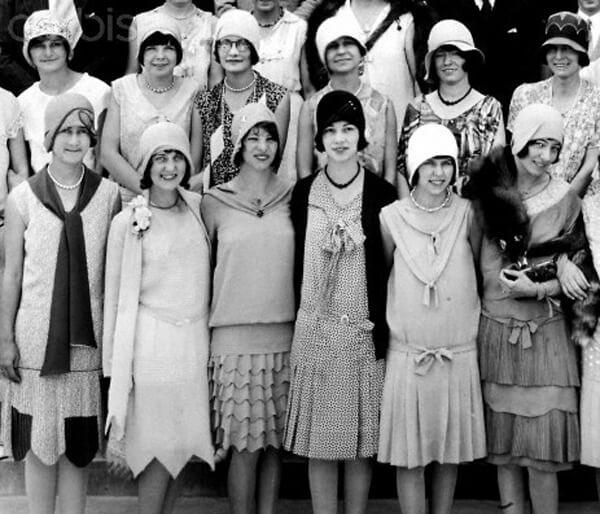 이브닝드레스에는 술을 달았고 단발머리에 종모양의 모자를 썼다. 긴 진주 목걸이와 긴 담배대가 액세서리로 등장 하였다.