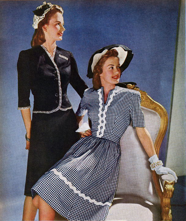 40년대는 2차 세계대전이 있었던 격동의 시기입니다. 2차 대전의 발발로 인해 패션도 위축되었으며, 물자의 극단적인 부족으로 인한 슬림 룩이 주류를 이루었으며, 실루엣은 더욱 가늘고 간결해졌습니다.