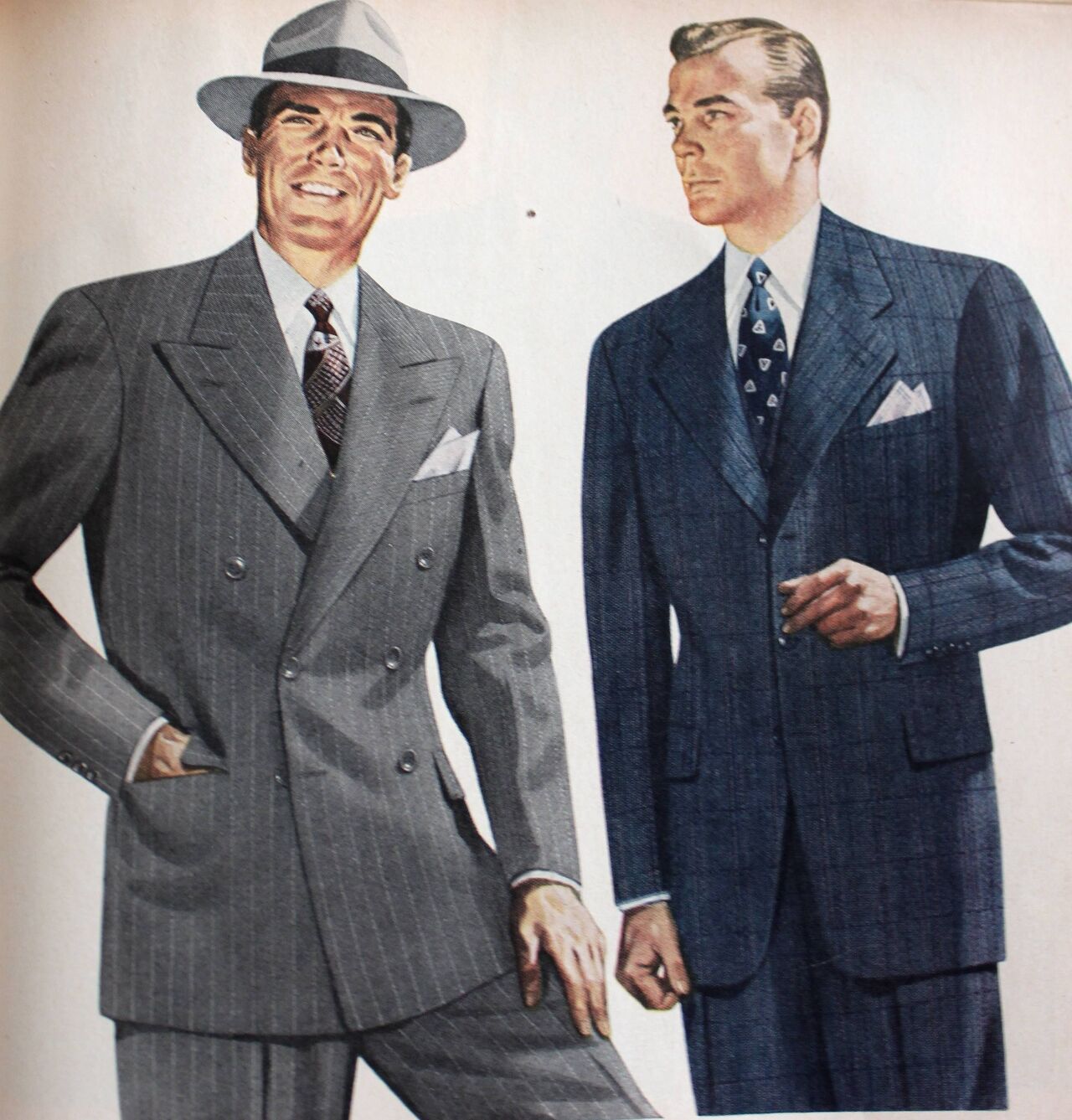 옷감 부족으로 쓸모없는 드레이프가 없어지고 더블 보다는 싱글, 쓰리피스 보다는 투피스 슈트로 전환되었습니다.