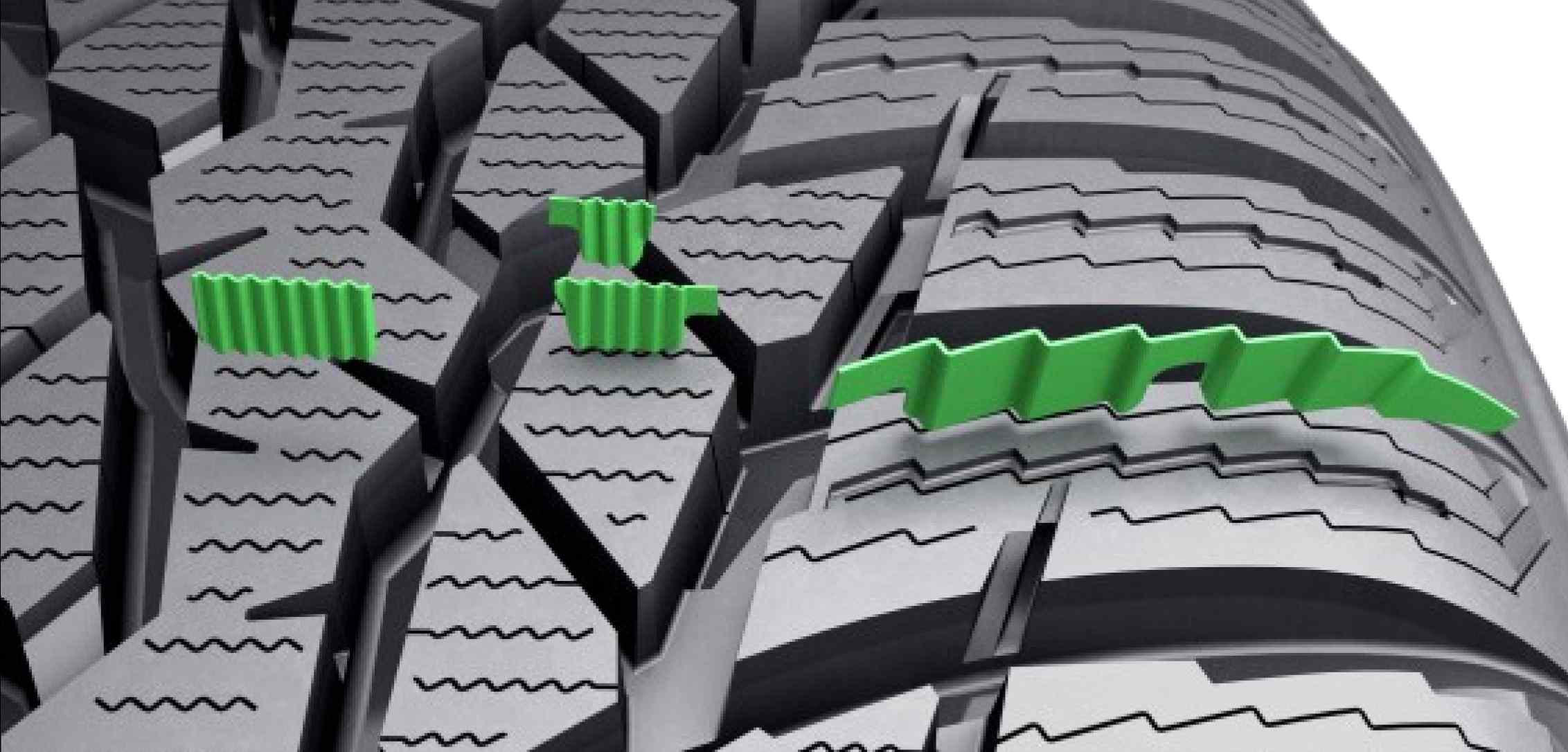 사이프는 타이어의 표면에 새겨진 얇은 실선으로, 숄더와 그루브 사이에 위치합니다. 이 벌어진 틈 덕분에 빗길과 눈길에서 타이어의 접지력을 향상시킬 수 있습니다. 사이프가 많은 윈터타이어는 눈길에서 더욱 안전하게 운전할 수 있습니다.