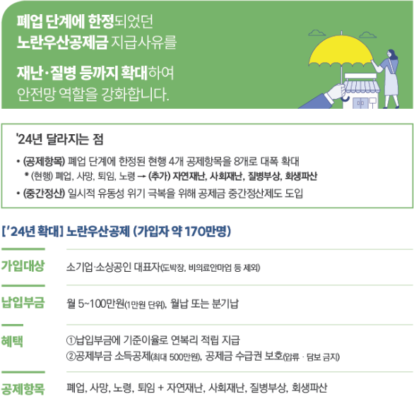 1) 폐업 단계에 한정되었던 노란 우산공제금 지급사유를 재난 · 질병 등까지 확대하여 안전망 역할 강화