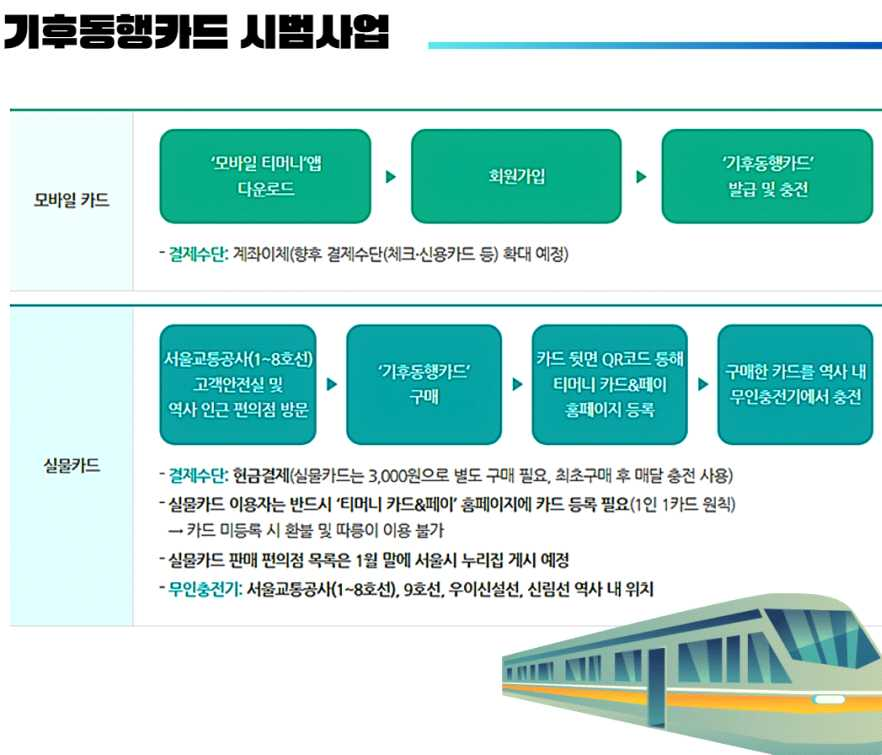 - 갤럭시 등 안드로이드 운영체제 휴대폰에서, 기후 동행 카드 앱을 통해 구매 · 충전 · 사용할 수 있습니다. 3천 원은 안 내도 됩니다.
