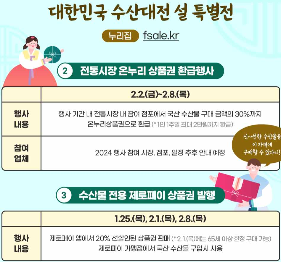 - 2.1.(목) 65세 이상 한정 구매 가능, 제로페이 가맹점에서 국산 수산물 구입 시 사용