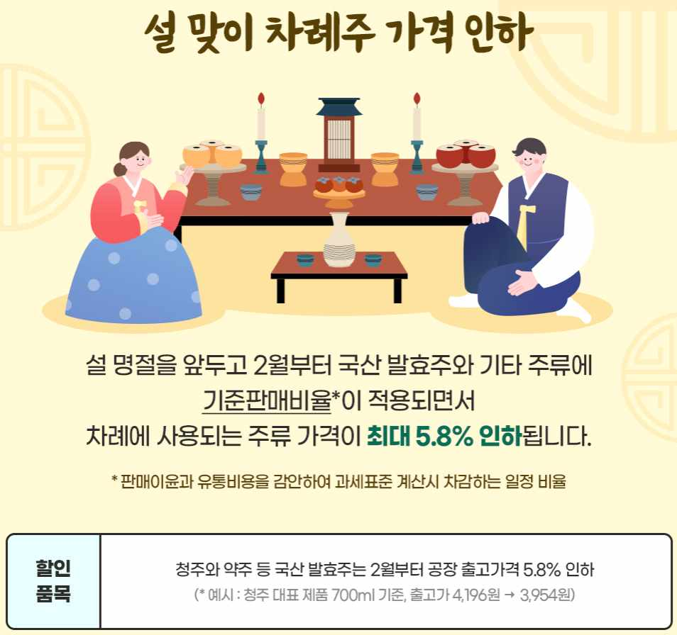 * 할인 품목 : 청주와 약주 등 국산 발효주는 2월부터 공장 출고 가격 5.8% 인하