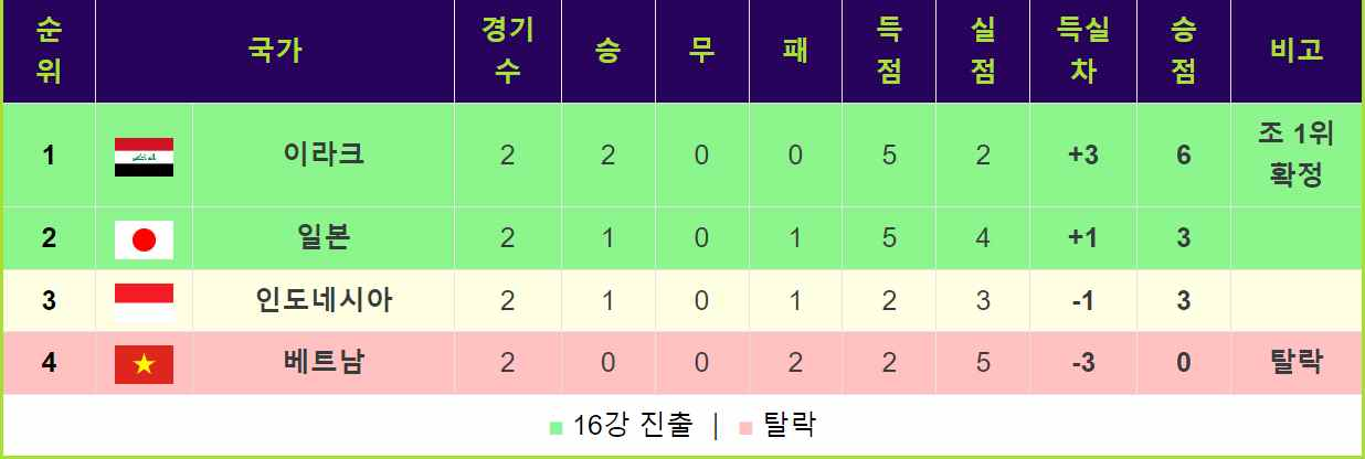2. 일본(승점 3)이 2차전에서 이라크(승점 6)에 1-2 충격 패를 당하는 바람에 조 1위 가능성은 사라짐