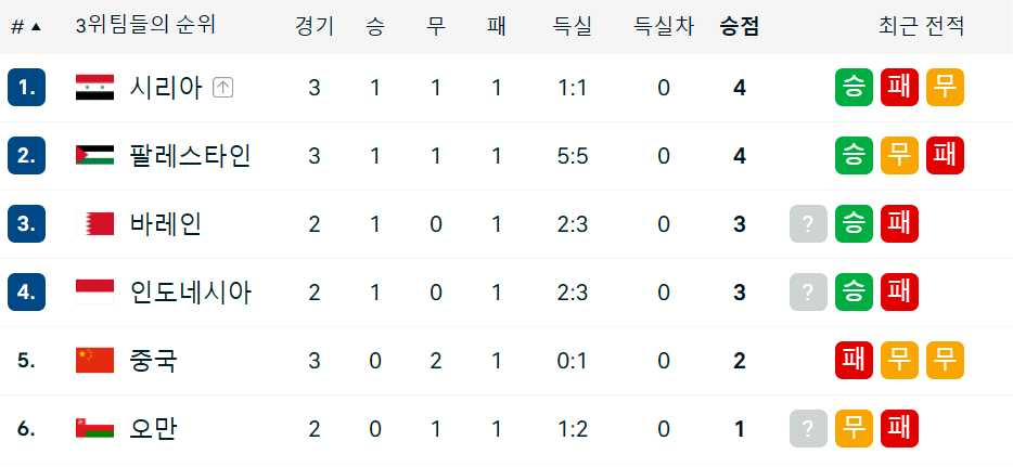 지난 15일 바레인과의 1차전에서 3-1로 승리를 거두고, 20일 요르단과의 2차전에서는 2-2로 비긴 한국은, 1승 1무를 거두고 승점 4를 쌓았는데, 선두 요르단(승점 4)에 골 득실 차(요르단 +4, 한국 +2)로 밀렸습니다.