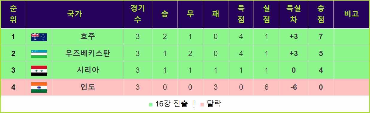 각 조 순위표 상황을 살펴보면, 1960년 이후 64년 만의 아시안컵 정상 탈환에 도전하는 한국은, 조 1위보다 조 2위로 16강에 오르는 것이 더 유리하게 작용할 것으로 보입니다.
