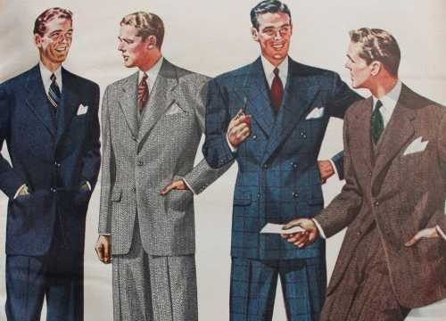 의상의 색상은 검정색, 청색과 같은 가라앉은 색상이 주류를 이루며, 슈트의 실루엣은 영국의 드레이프 슈트의 연속이었으며, 이 모델을 원형으로 미국식, 프랑스식, 이탈리아식의 스타일로 정돈되어져 가게 됩니다.