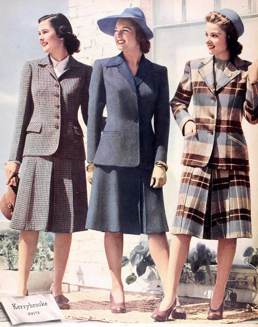 스커트는 통이 좁고 짧았는데, 이는 2차대전의 영향으로 옷감이 부족하게 되어 나타난 경향입니다. 또한 앞이마에 걸치듯이 쓰는 작은 모자가 유행했습니다.