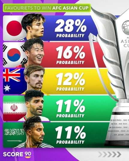 ◆ 축구 콘텐츠 제작소 'score90', 아시안컵 우승 확률 상위 TOP 10 선정