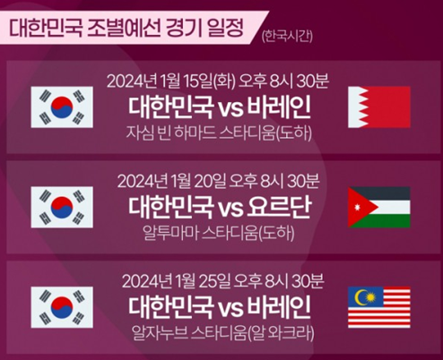 1) 1차전 : 2024년 1월 15일(토) 오후 8시 30분, 대한민국 VS 바레인(3 : 1승)